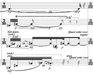 However, it is the coloristic effects that form the most significant element of this work. It is my intention to create a ‘metallic’ effect by staggering the timbral effects so that the vibrations react with one another. Rather like the natural harmonics effect of orchestral string writing, it is not normally discernible on its own but with a microphone it can be picked up: